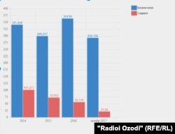 Дар ҳоле ки мақомоти Тоҷикистон мегӯянд, тайи тақрибан се соли ахир ҳосили мева дар кишвар коҳиш наёфт, содироти он ба хориҷ якбора кам шудааст. Агар дар соли 2014 аз Тоҷикистон ба хориҷа беш аз 100 ҳазор тонна меваи хушк содир шуда буд, ин рақам дар соли 2016 то 56 ҳазор тонна поин омад.
